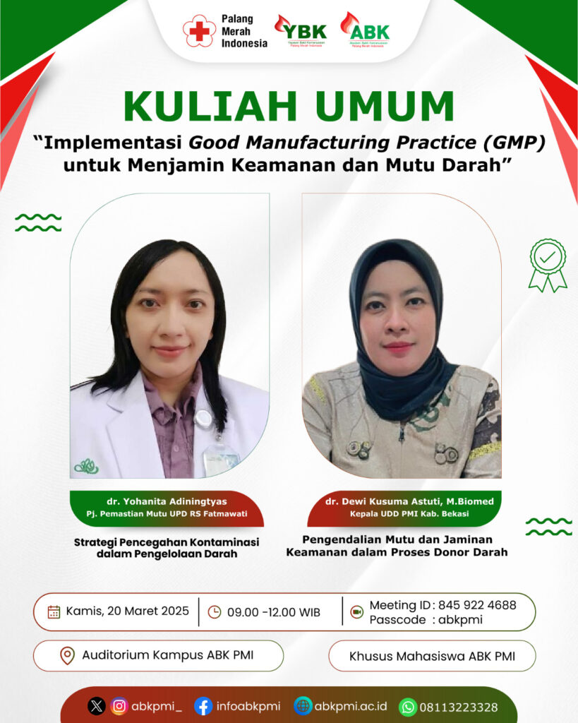 Kuliah Umum “Implementasi Good Manufacturing Practice (GMP) untuk Menjamin Keamanan dan Mutu Darah” dilaksanakan pada tanggal 20 Maret 2025 dengan pembicara :