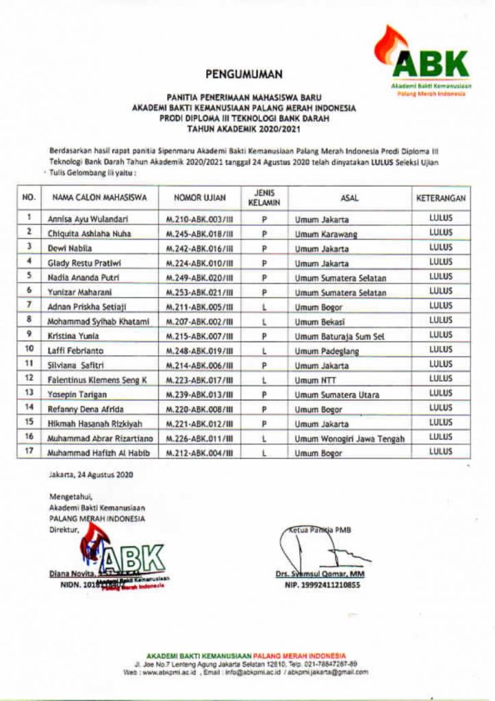 Akademi Bakti Kemanusiaan Palang Merah Indonesia merupakan Jenjang Pendidikan Tinggi Program Studi Diploma III Teknologi Bank Darah yang diselenggarakan oleh Yayasan Bakti Kemanusiaan Palang Merah Indonesia mulai tahun 2016 dibawah naungan Palang Merah Indonesia dan telah disyahkan oleh Surat Keputusan Menteri Riset, Teknologi, dan Pendidikan Tinggi Republik Indonesia