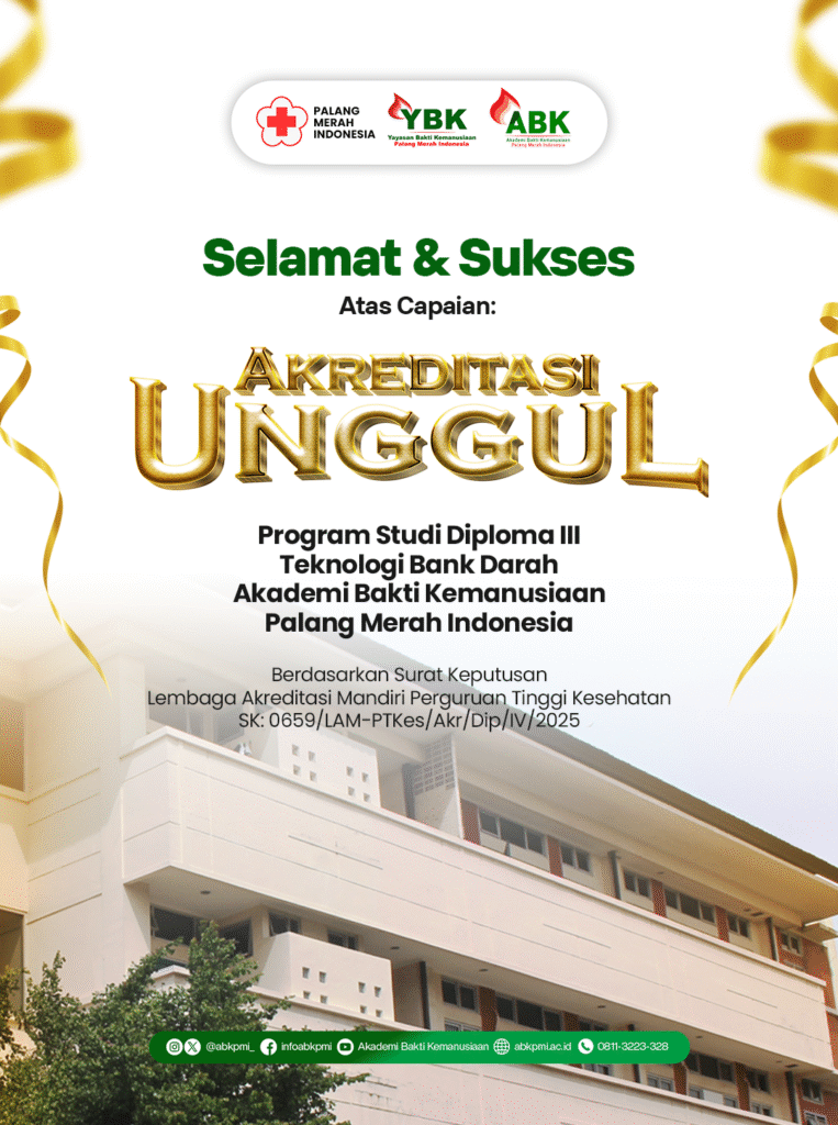 Program studi Diploma III Teknologi Bank Darah Akademi Bakti Kemanusiaan Palang Merah Indonesia (ABK PMI) resmi meraih pencapaian membanggakan dengan ditetapkannya predikat Akreditasi Unggul oleh Lembaga Akreditasi Mandiri Pendidikan Tinggi Kesehatan (LAM-PTKes) berdasarkan Surat Keputusan Nomor: 0659/LAM-PTKes/Akr/Dip/IV/2025.